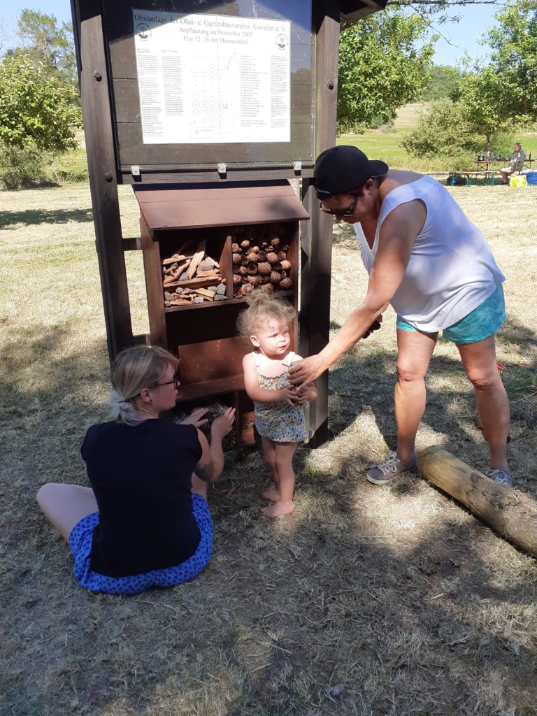 Nachdem der neue Vorstand seine Arbeit aufgenommen hatte, stand auch die Pflege der Streuobstwiese auf dem Programm. Hierzu wurde für den 29.06.19 zu einem Arbeitseinsatz aufgerufen. Es fanden sich viele fleißige Helfer ein. Bei strahlendem Sonnenschein wurde die Wiese gemäht und die Ränder gesäubert. Die Infotafel erhielt einen neuen Anstrich und wir bauten gemeinsam ein Insektenhotel. Dieses wurde anschließend unter der Infotafel befestigt und befüllt. Nach getaner Arbeit, machten wir es uns unter den Bäumen gemütlich und es gab kühle Getränke und Würstchen vom Grill. Da es uns in der Streuobstwiese so gut gefiel, haben wir kurzfristig ein paar Zelte aufgeschlagen und dort übernachtet. Ein toller Tag!